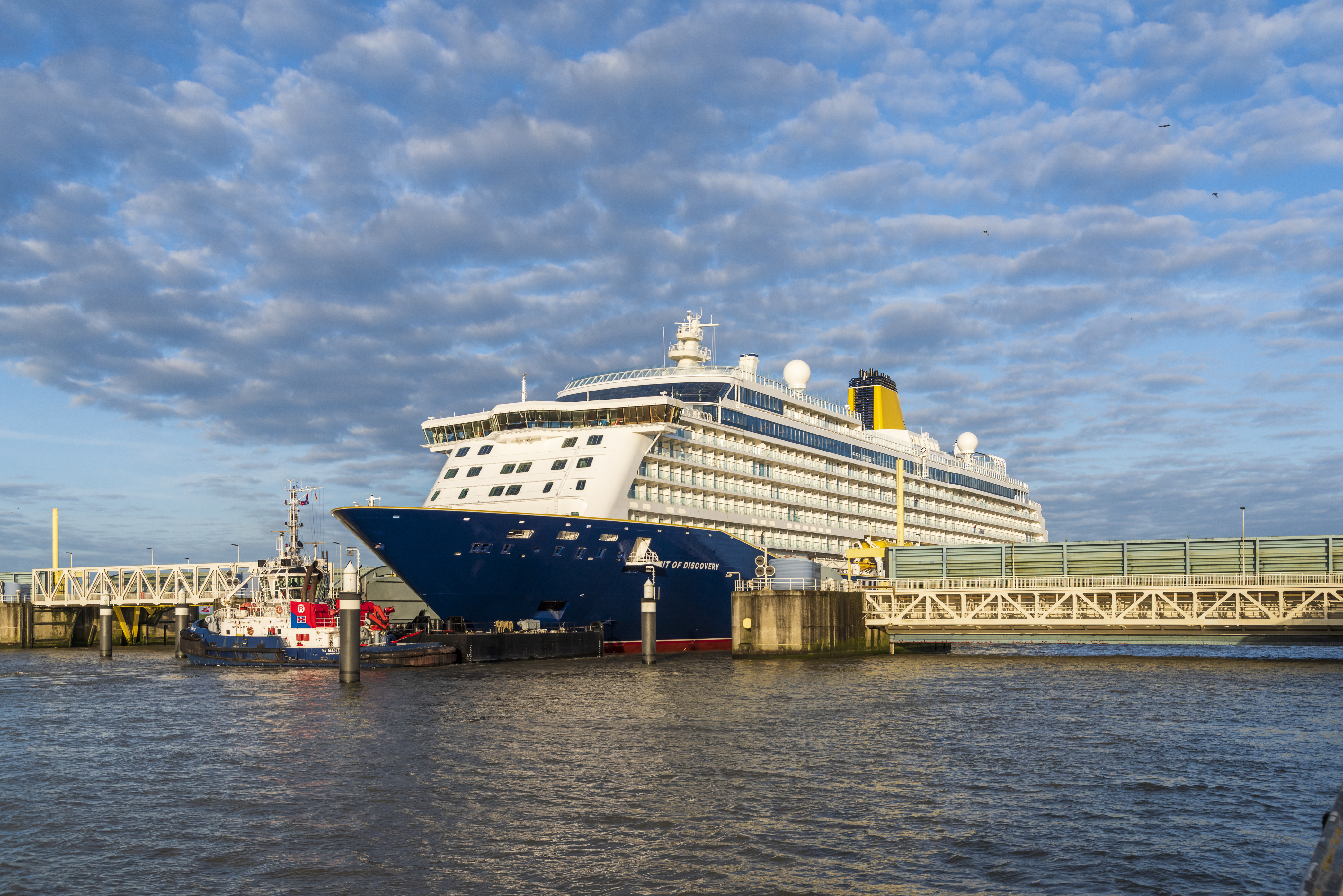 Following her departure, Spirit of Discovery was towed along the River Ems, from Papenburg to Emden, passing Friesenbrücke (Weener) and the Jann Berghaus bridge (Leer), before arriving at the River Ems barrier and passing through to arrive at Emden sea lock at 8am.